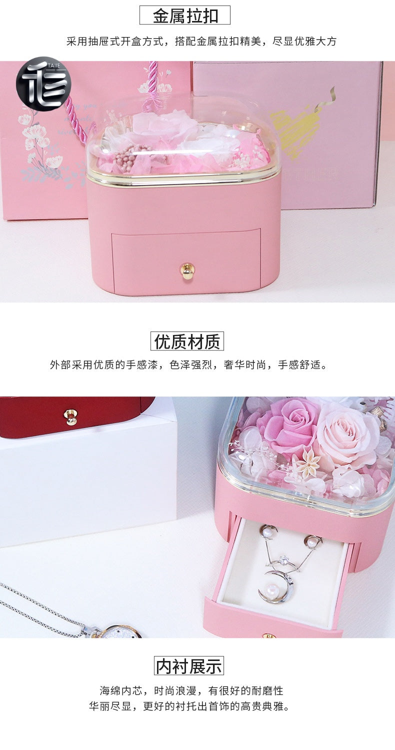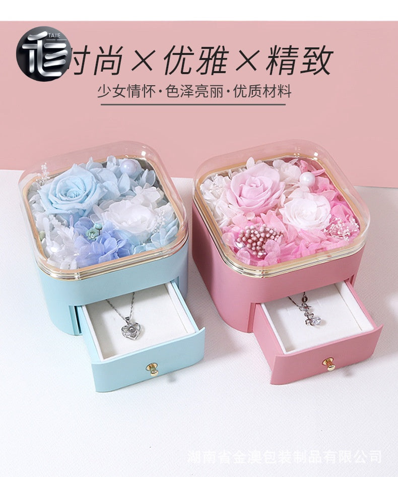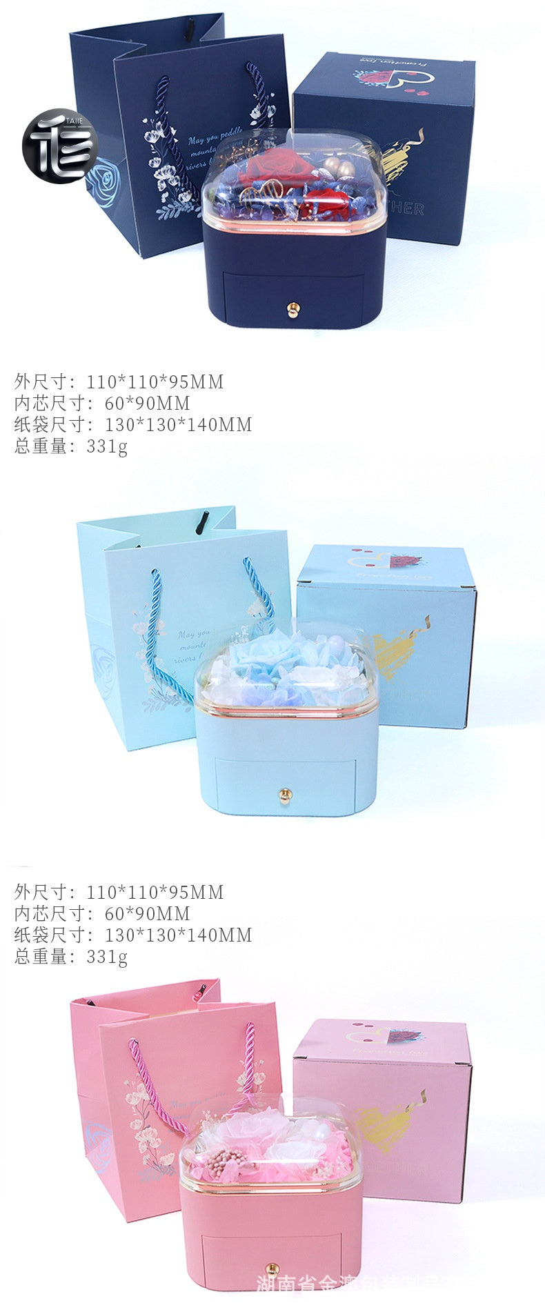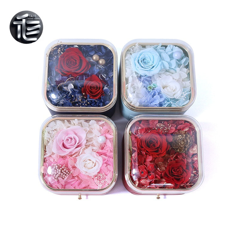 High-end design: The plastic body is sprayed with matte piano lacquer, the bread-shaped high-transparency acrylic lid displays rose flowers inside, golden snap fasteners, and when opened, a set is placed inside, bringing continuous surprises