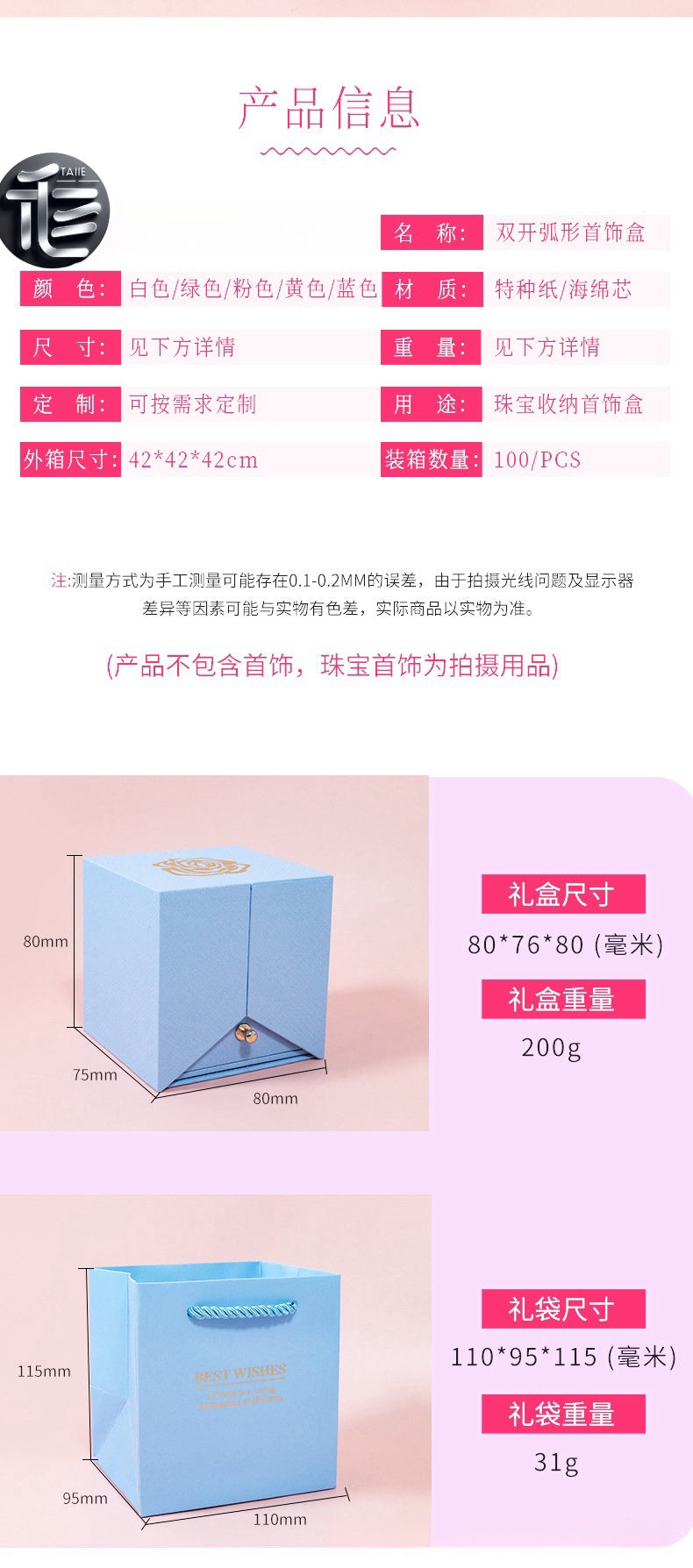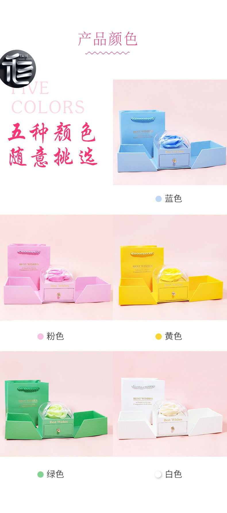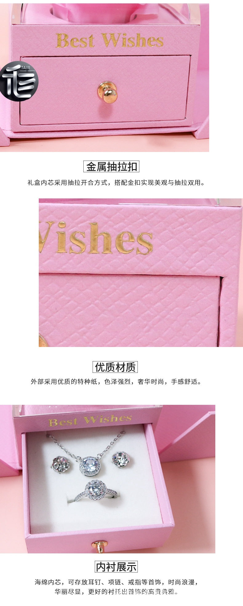 High-end design: Plastic body, wrapped with special paper embossed in rose gold color, golden snap fasteners, double doors open to place the set, full of surprises and unexpected delights