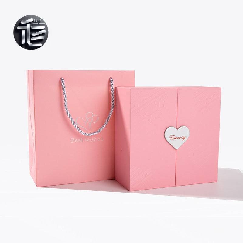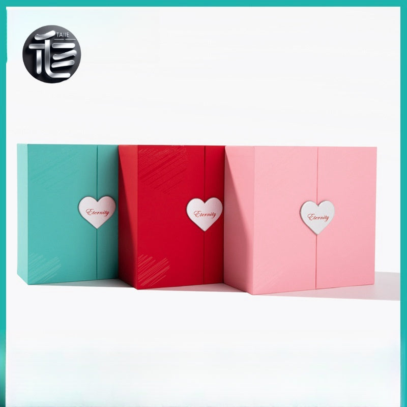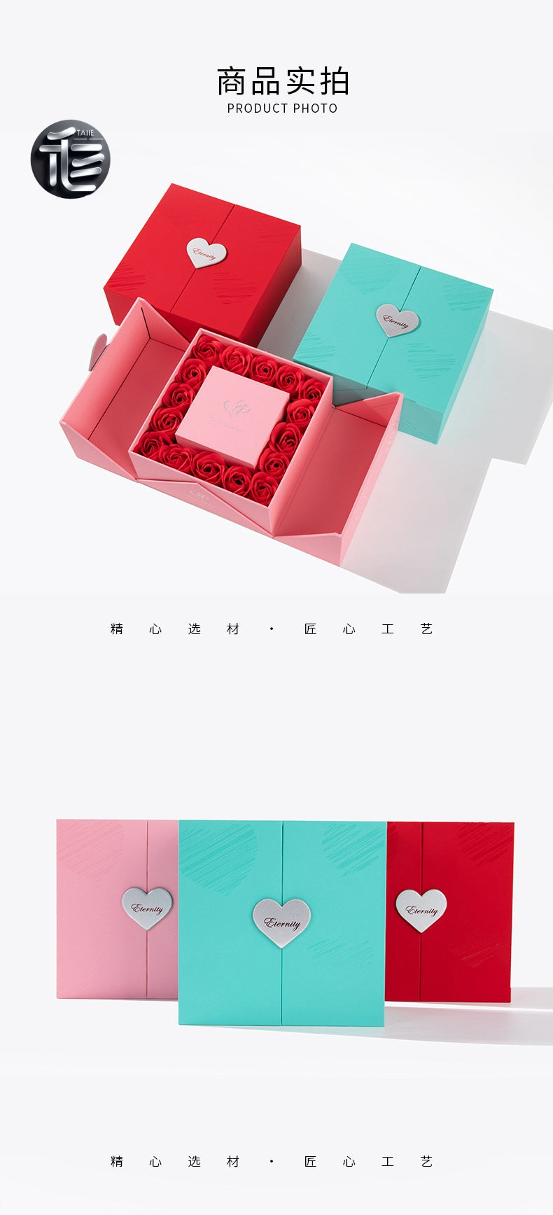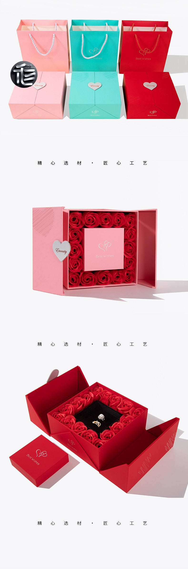 High-end design: Cardstock body, double doors with heart-shaped buttons, the interior is surrounded by red artificial roses, and the inner box is made of high-quality velvet material